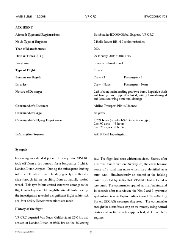 AAIB Bulletin 12/2008 EW/C2008/01/03, Bombardier BD700 Global Express, VP-CRC, London Luton, 29 Jan