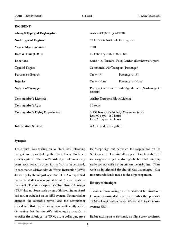 AAIB Bulletin 2/2008 EW/C2007/02/03, Airbus A319-131, G-EUOF, London Heathrow, 12 Feb 2007