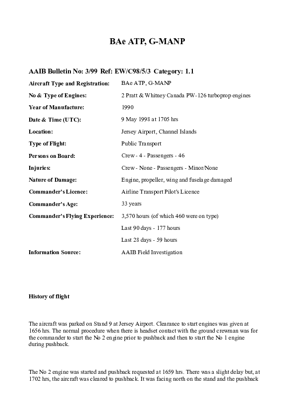 AAIB Bulletin 3/99 EW/C98/5/3 Category: 1.1, BAe ATP, G-MANP, Jersey Airport, 9 May 1998