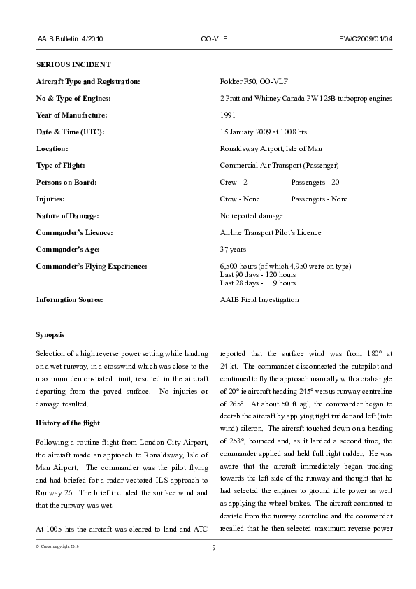 AAIB Bulletin 4/2010 EW/C2009/01/04, Fokker F50, OO-VLF, Isle of Man, 15 Jan 2009