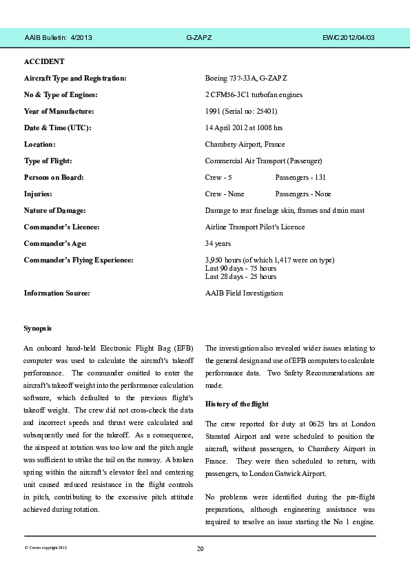 Erroneous parameters at take off. On 14 April 2012, a Titan Airways Boeing 737-300 attempted to take off from Chambery with incorrect reference speeds taken from the EFB used for performance calculations. As a consequence, the pressure hull was damaged by a tail strike during take off, although not sufficiently to affect cabin pressure during the subsequent flight. The Investigation concluded that the accident raised regulatory issues in respect of the general design and use of EFB computers to calculate performance data.
