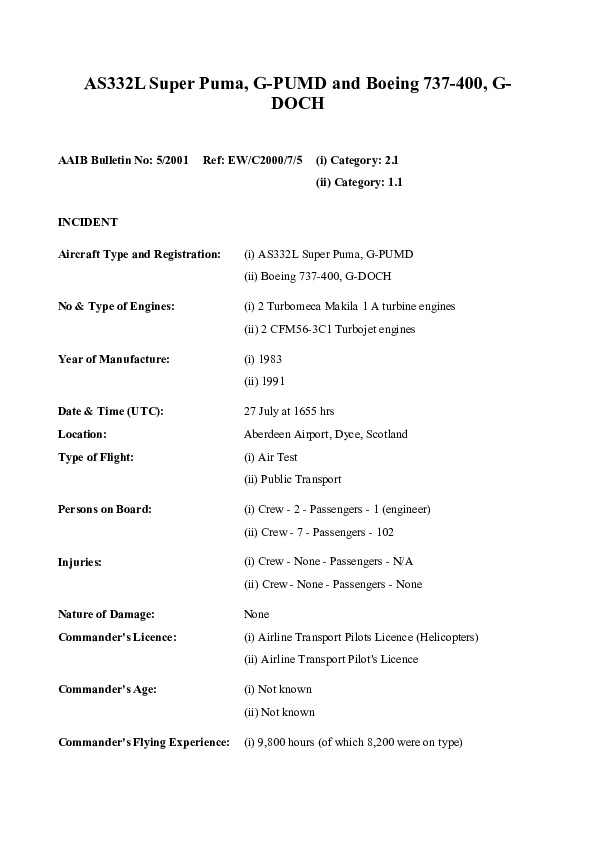 AAIB Bulletin 5/2001 EW/C2000/7/5, AS332L Super Puma, G-PUMD / Boeing 737-400. G_DOCH, Aberdeen, 2