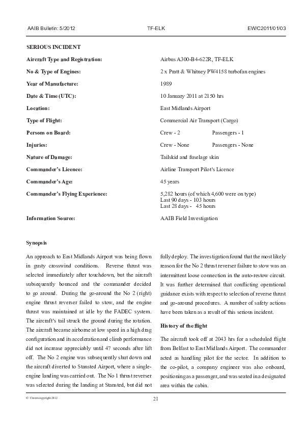AAIB Bulletin 5/2012 EW/C2011/01/03, Airbus A300-B4-622R, TF-ELK, East Midlands UK, 10 Jan 2011