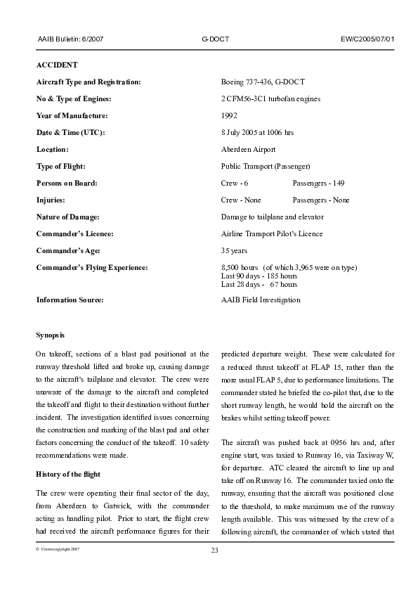 AAIB Bulletin 6/2007 EW/C2005/07/01, Boeing 737-436, G-DOCT, Aberdeen Airport UK, 8 Jul 2005