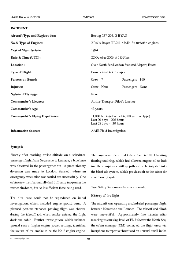 AAIB Bulletin 6/2009 - Serious Incident, Boeing B757-204, G-BYAO, London Stansted 22 Oct 2006
