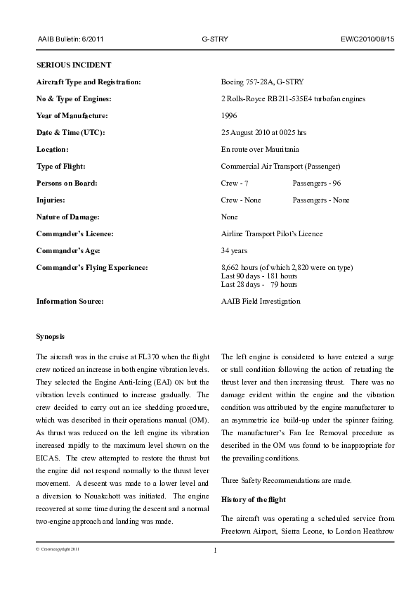 AAIB Bulletin 6/2011 EW/C2010/08/15, Boeing 757-28A, G-STRY, over Mauritania, 25 Aug 2010