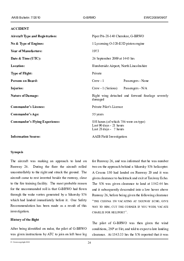 Wake turbulence encounter. On 26 September 2009, a privately operated Piper PA28-140 with only the pilot on board was about to touch down on Runway 26 at Humberside Airport, North Lincolnshire UK after a day VMC approach when the aircraft rolled uncontrollably to the right in the flare and struck the ground. The aircraft came to rest inverted beside the runway and suffered significant damage but there was no fire. The pilot sustained serious injuries.