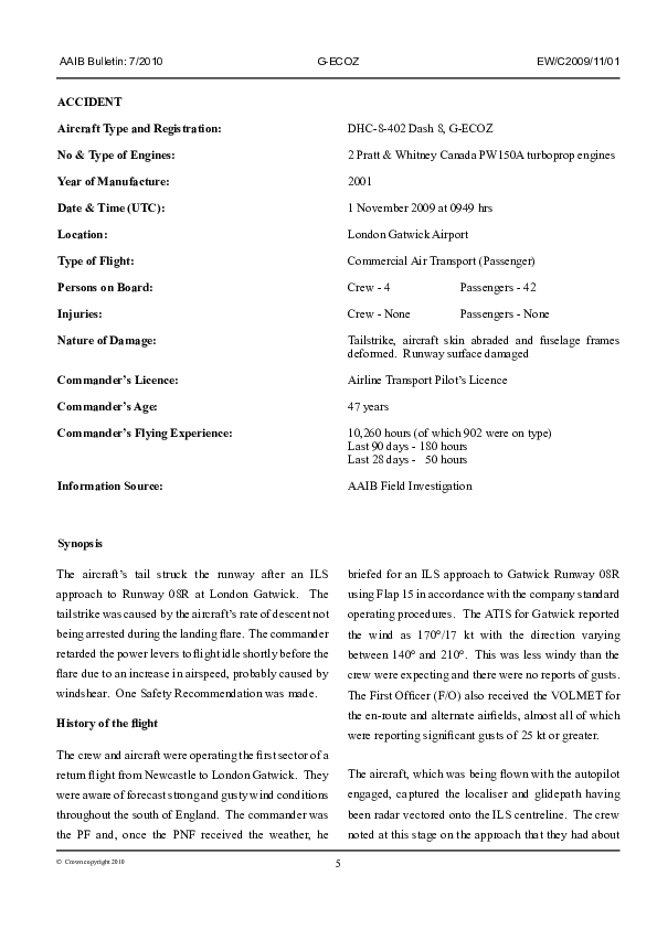 AAIB Bulletin 7/2010 EW/C2009/11/01, DHC-8-402 Dash 8, G-ECOZ, London Gatwick, 1 Nov 2009