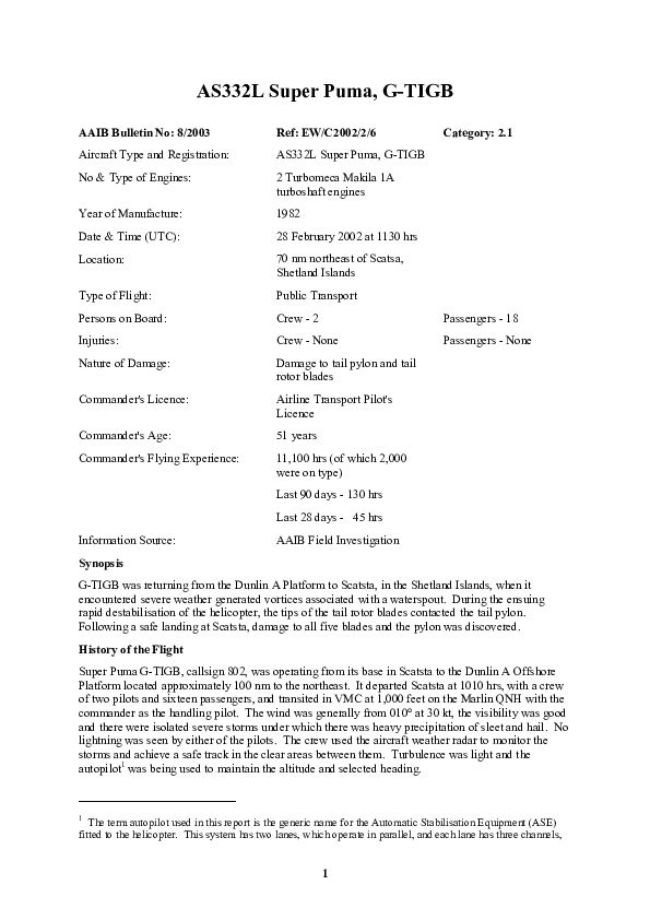 AAIB Bulletin 8/2003 EW/C2002/2/6, AS332L Super Puma, G-TIGB, 70 nm NE Scatsa, Shetland Islands,