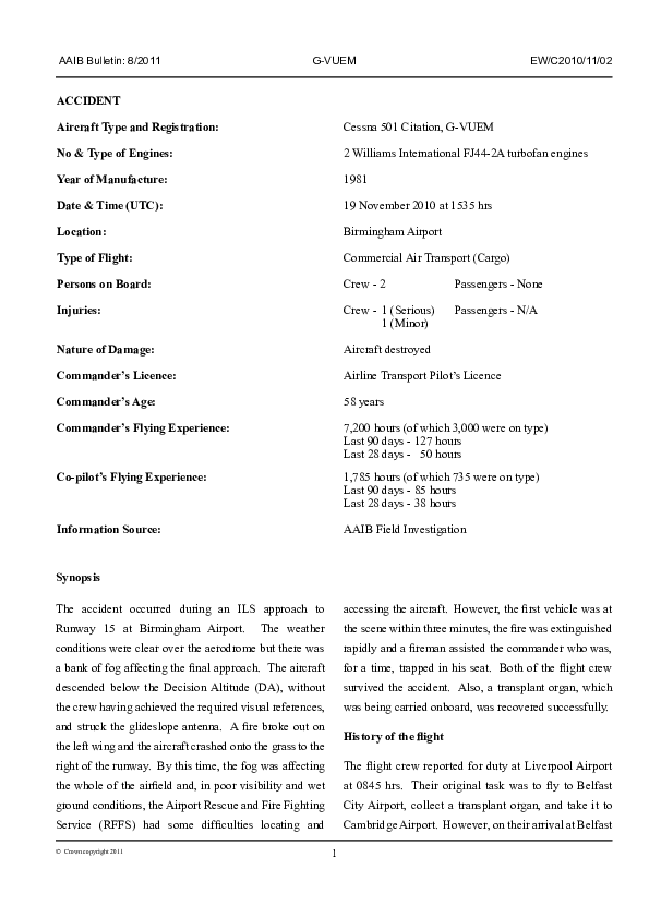On 19 November 2010, a Cessna 501 being operated by The Frandley Aviation Partnership on a domestic cargo flight from Belfast Aldergrove to Birmingham continued descent on an initially visual day ILS approach to Runway 15 into IMC and until collision with the ILS GS aerial adjacent to the intended landing runway occurred. The aircraft caught fire and was destroyed. Both pilots were injured, one seriously.