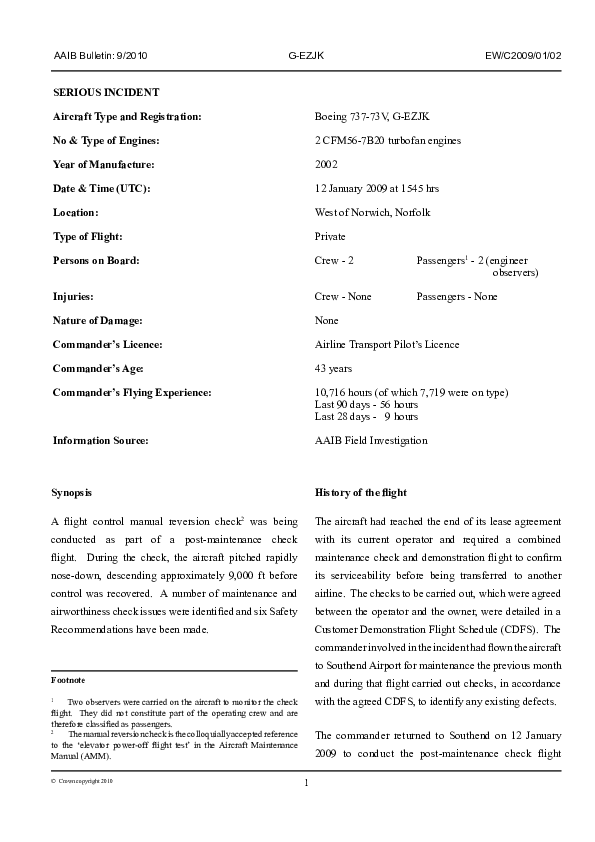 AAIB Bulletin 9/2010 EW/C2009/01/02, Boeing 737-73V, G-EZJK, west of Norwich UK, 12 Jan 2009