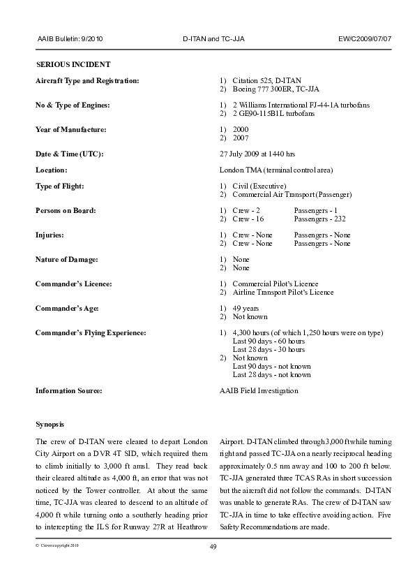 AAIB Bulletin 9/2010 EW/C2009/07/07, Citation 525, D-ITAN / Boeing 777-300ER, TC-JJA, London TMA, 27
