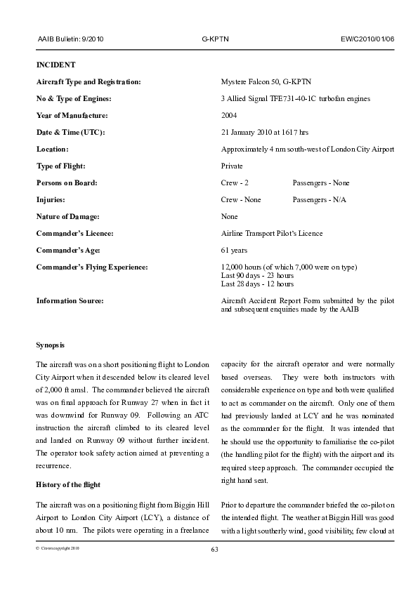 AAIB Bulletin 9/2010 EW/C2010/01/06, Mystere Falcon 50, G-KPTN, London City Airport, 21 Jan 2010