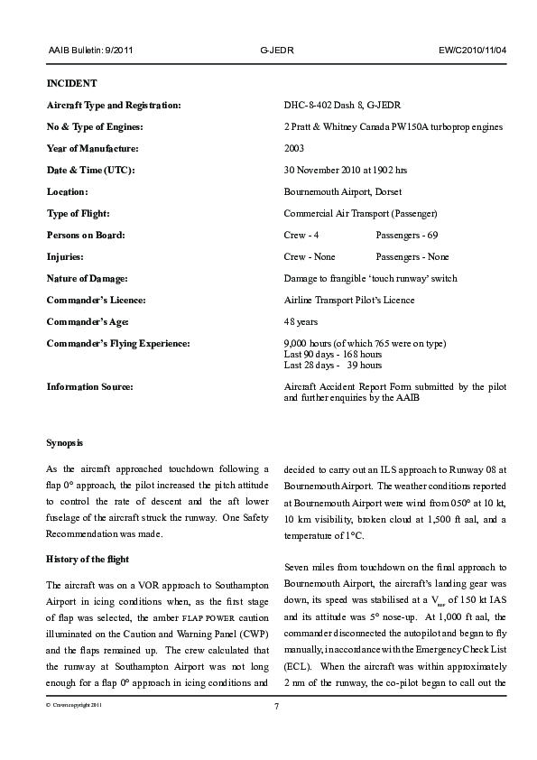 AAIB Bulletin 9/2011 EW/C2010/11/04, DHC-8-402 Dash 8, G-JEDR, Bournemouth Airport UK, 30 Nov 2010