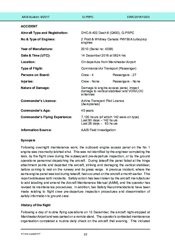 G-PRPC EW/C2016/12/03 Following overnight maintenance work, the outboard engine access panel on the No 1 engine was incorrectly latched shut. This was not identified by the engineer completing the task, by the flight crew during the subsequent pre-departure inspection, or by the ground operations personnel dispatching the aircraft. During takeoff the panel failed at the hinge attachment points and departed the aircraft, striking and damaging the vertical stabiliser, before coming to rest on the runway and its grass verge. A previous incident, where the same engine panel was lost during takeoff, had occurred on the aircraft a month earlier. This report addresses both incidents. Safety action has been taken by the aircraft manufacturer to add labelling and amend the Aircraft Maintenance Manual (AMM), and the operator has revised its maintenance procedures. In addition, two Safety Recommendations have been made relating to flight crew pre-departure inspection procedures and dissemination of safety information to ground crew.