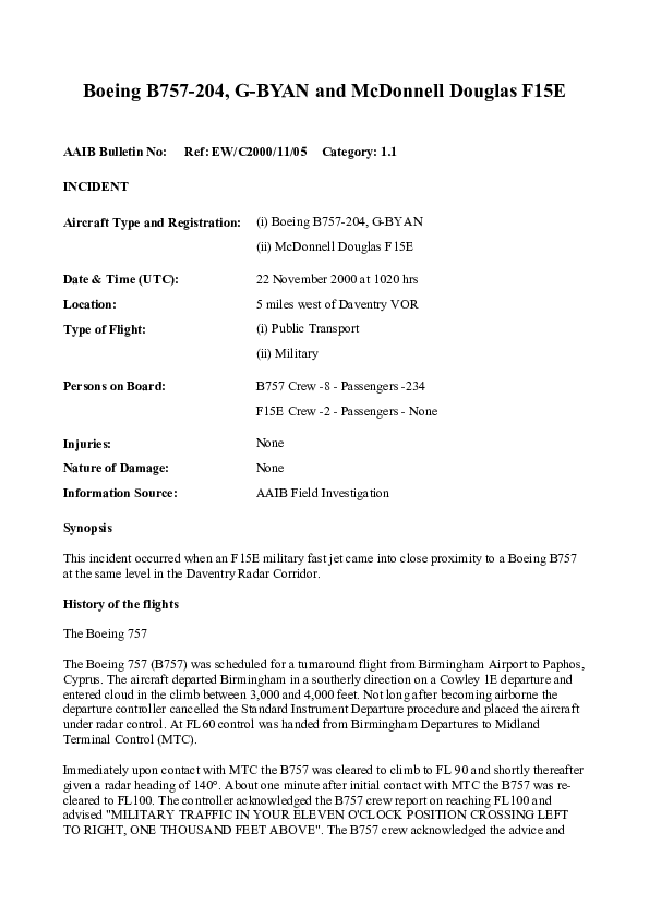 AAIB Bulletin EW/C2000/11/05 Category: 1.1, Boeing 757-204, G-Byan / McDonnell Douglas F15E, Dav