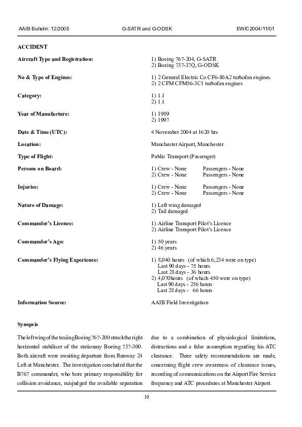 AAIB Bulletin12/2005 EW/C2004/11/01, Boeing 767-204, G-SATR / Boeing 737-37Q, G-ODSK, Manchester 4 N
