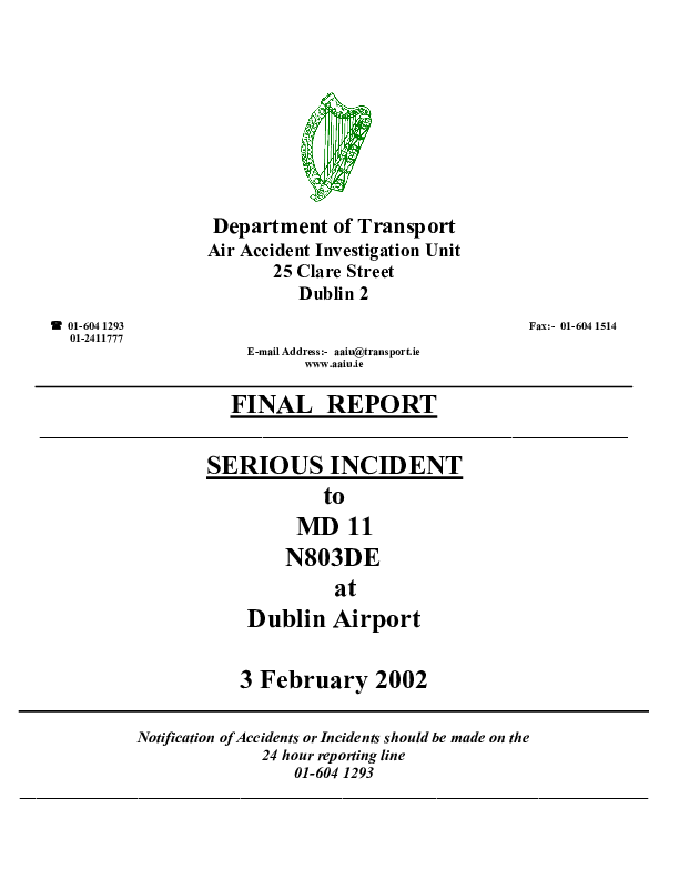 AAIU - Final Report MD 11, N803DE, Dublin Ireland, 3 Feb. 2002