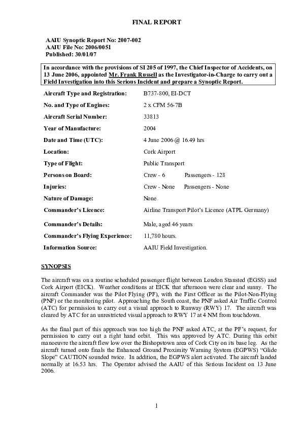 AAIU Report 2007-002, B737-800, EI-DCT, Cork Airport, 4 Jun 2006