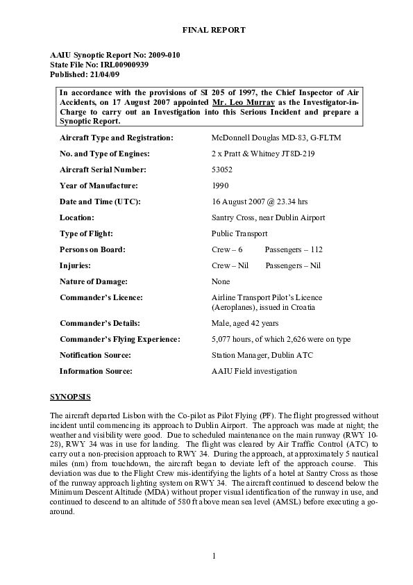 AAIU - Report 2009-010, MD83, G-FLTM, near Dublin Airport, 16 Aug 2007