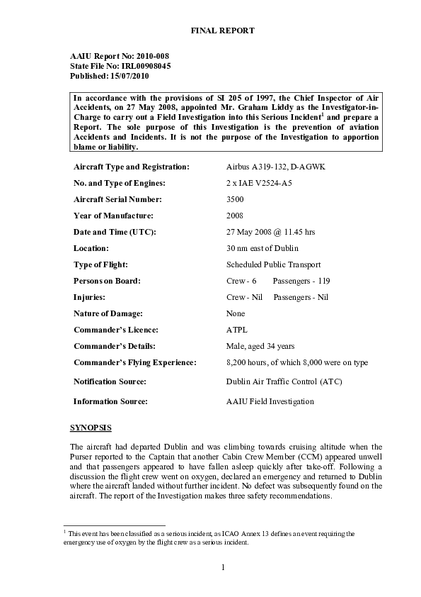 AAIU Report 2010-008, A319-132, D-AGWK, near Dublin, 27 May 2008