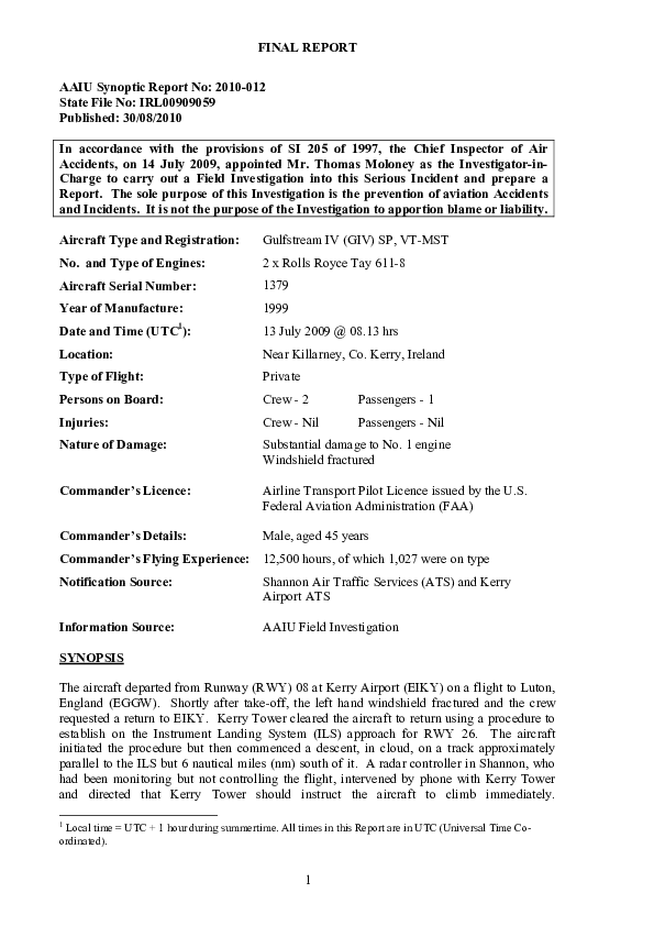 AAIU Report 2010-012, Gulfstream IV, VT-MST, Killarney Ireland, 13 Jul 2009
