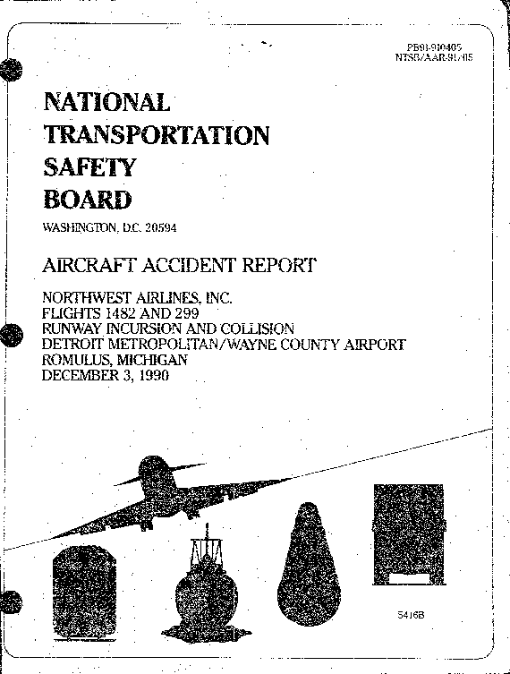 On 3 December 1990 a Douglas DC9-10 flight crew taxiing for departure at Detroit in thick fog got lost and ended up stopped to one side of an active runway where, shortly after reporting their position, their aircraft was hit by a departing Boeing 727-200 and destroyed by the impact and subsequent fire. The Investigation concluded that the DC9 crew had failed to communicate positional uncertainty quickly enough but that their difficulties had been compounded by deficiencies in both the standard of air traffic service and airport surface markings, signage and lighting undetected by safety regulator oversight. Editor's Note: Page 67 missing.