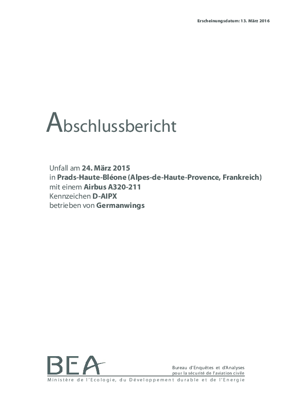 Abschlussbericht Unfall am 24. März 2015 in Prads-Haute-Bl one (Alpes-de-Haute Provence, Frankreich) mit einem Airbus A320-211 Kennzeichen D-AIPX betrieben von Germanwings.