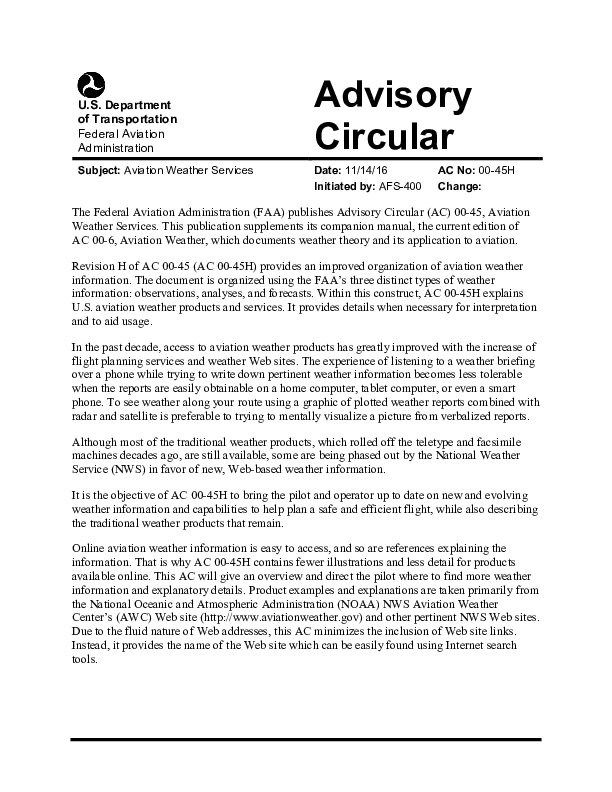 Revision H to Advisory Circular 00-45 on subject of Aviation Weather Services.