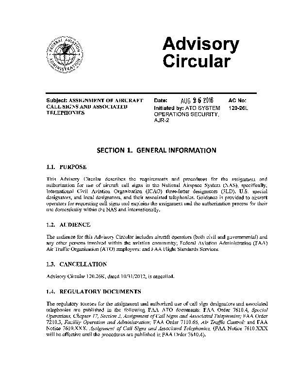 AC 120-26L Assignment of Aircraft Call Signs and Associated Telephonies