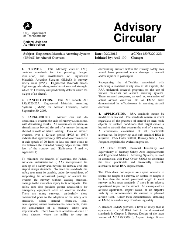 AC 150/5220-22B: Engineered Materials Arresting Systems (EMAS) for Aircraft Overruns