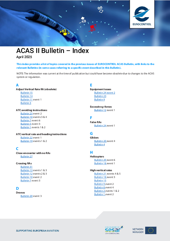 This index provides a list of topics covered in the previous issues of EUROCONTROL ACAS Bulletin, with links to the relevant Bulletins (in some cases referring to a specific event described in this Bulletin).