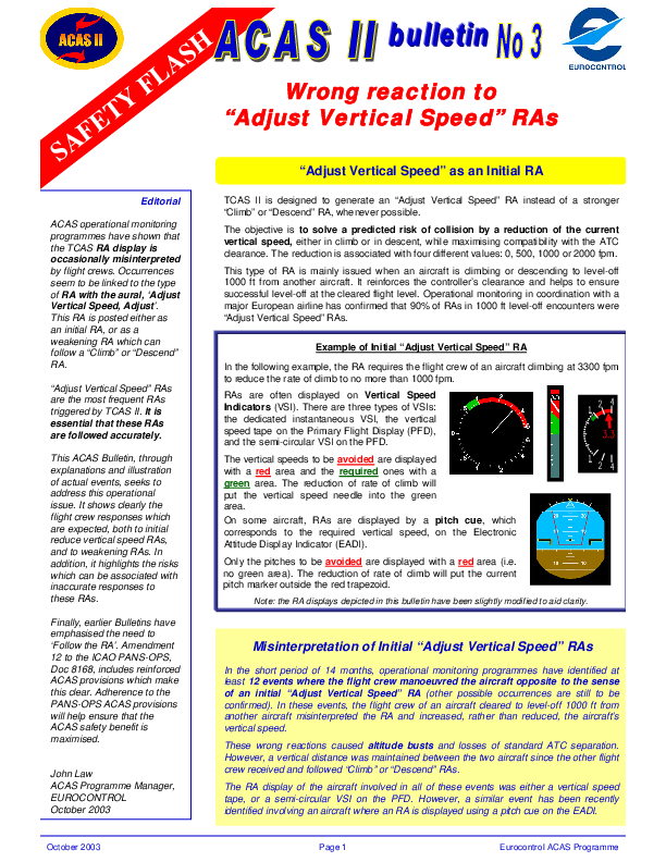 “Adjust Vertical Speed†RAs are the most frequent RAs triggered by TCAS II. It is essential that these RAs are followed accurately. This ACAS Bulletin, through explanations and illustration of actual events, seeks to address this operational issue.