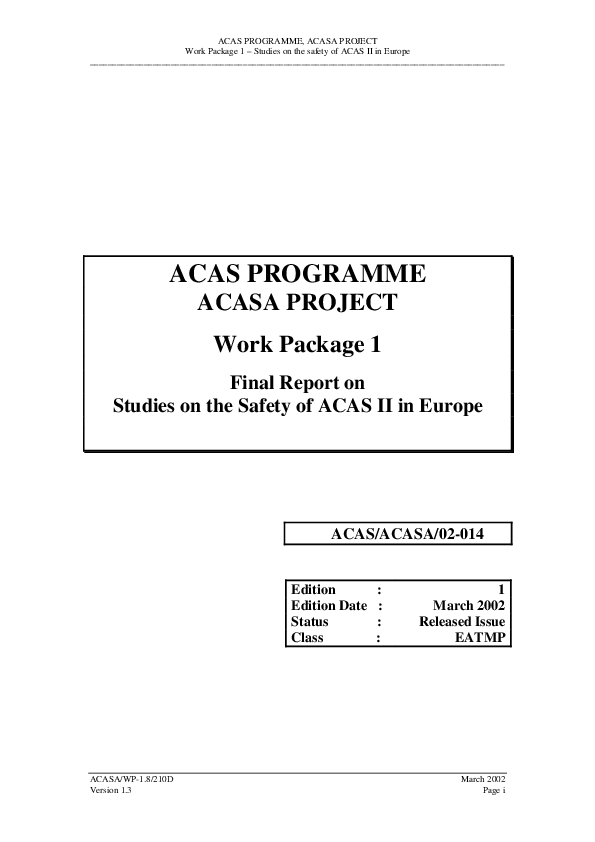 ACAS II is an airborne avionics system designed to reduce the risk of mid-air collision. Its carriage by a majority of aircraft within Europe is mandatory. ACASA is a set of studies that has investigated several areas related to ACAS II operations in Europe. Work Package 1 of the ACASA project investigated safety. The safety of ACAS was assessed purely in terms of the degree to which it achieved its stated aim of preventing mid-air collisions.