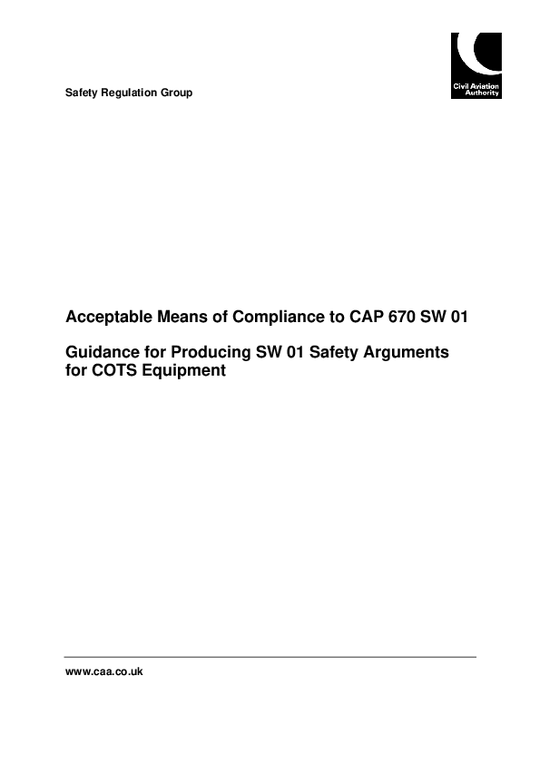 The purpose of this document is to provide guidance to Air Navigation Service Providers (ANSPs) and their suppliers on addressing the objectives of CAP 670 SW 01 (Reference 1) when deploying COTS equipment. This Guidance only addresses the safety assurance required by SW 01 for the software content of Commercial Off The Shelf (COTS) equipment. It therefore does not replace the need to demonstrate satisfaction of the System Safety Requirements in the manner required by the ANSP’s Safety Management System (SMS) or as specified in the applicable contract for equipment supply.