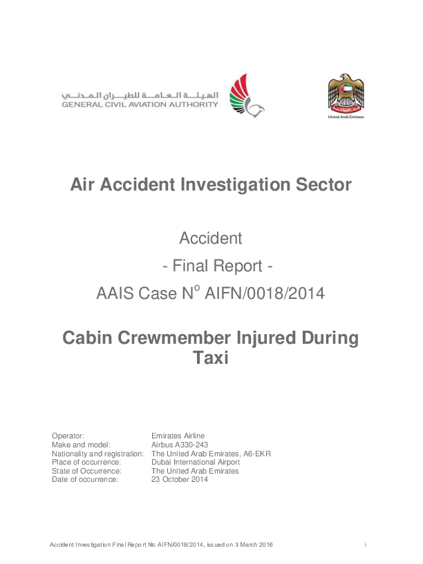 Accident Final Report AIFN/0018/2014 Cabin Crewmember Injured During Taxi A332 Dubai UAE 23/10/14