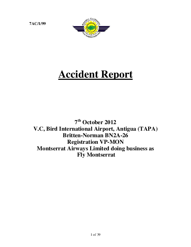 Accident Report, 7th October 2012, V.C, Bird International Airport, Antigua (TAPA), Britten-Norman B