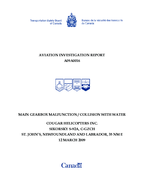 Accident Report A09A0016, S92 main gearbox malfunction and impact with water, Canada, 12 March 2009