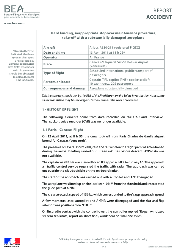 On 13 April 2013, an Air France Airbus A330-200 was damaged during a hard (2.74 G) landing at Caracas after the aircraft commander continued despite the aircraft becoming unstabilised below 500 feet agl with an EGPWS ‘SINK RATE’ activation beginning in the flare. Following a superficial inspection, maintenance personnel determined that no action was required and released the aircraft to service. After take off, it was impossible to retract the landing gear and the aircraft returned. Considerable damage from the earlier landing was then found to both fuselage and landing gear which had rendered the aircraft unfit to fly.