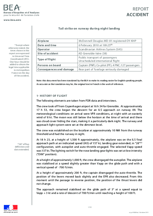 Accident Report oy-p100206a/Oct 2011 - tail strike during night landing, Grenoble, 6 Feb 2010