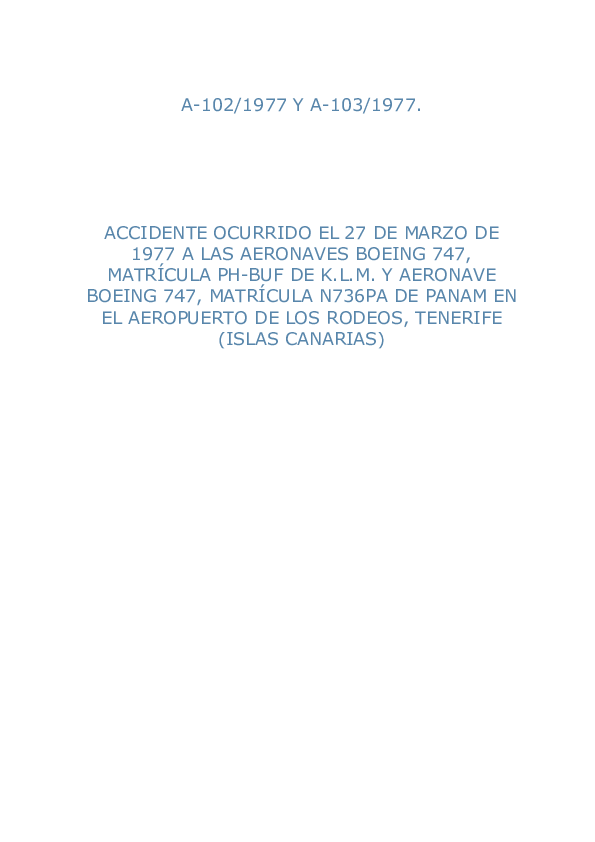 Collated original Spanish version of the Official Report following the collision of two Boeing 747 aircraft at Los Rodeos airport, Tenerife, Spain on the 27th March 1977.