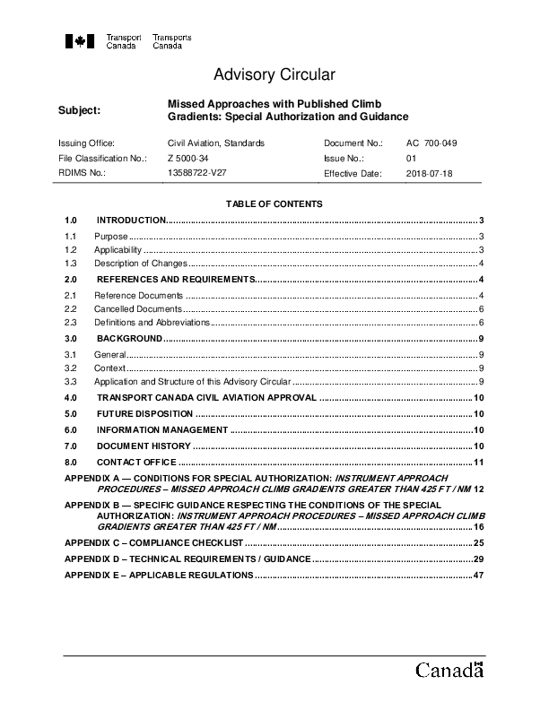 Advisory Circular 700-049 - Missed Approaches with Published Climb Gradients: Special Authorization