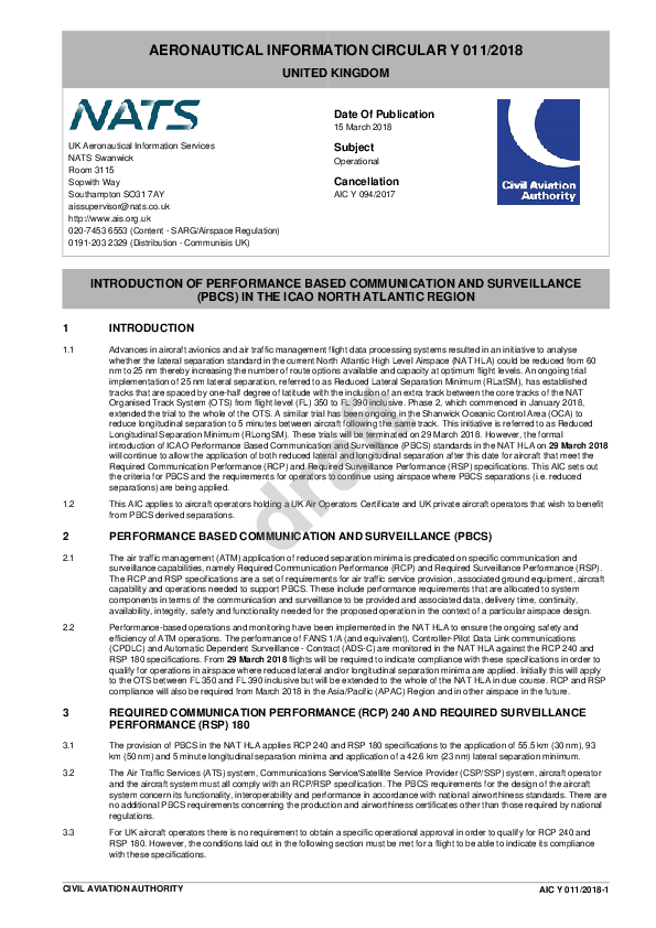 This AIC sets out the criteria for PBCS and the requirements for operators to continue using airspace where PBCS separations (i.e. reduced separations) are being applied.