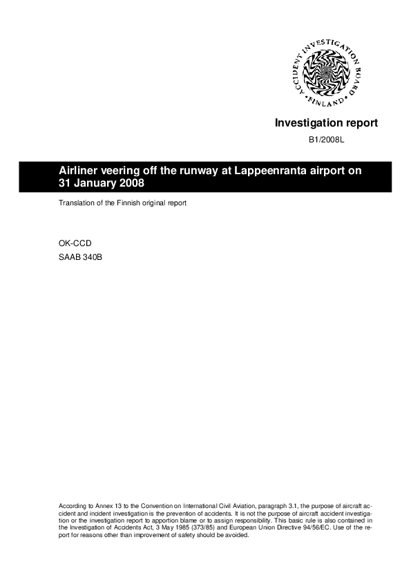 AIB - Investigation report B1/2008L, SF34 Runway excursion, Lappeenranta Finland, 21 Jan 2008