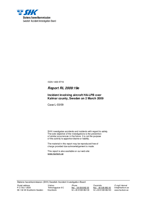 AIB - Report RL 2009:19e, A320 Smoke in the cabin, Kalmar County Sweden, 2 March 2009