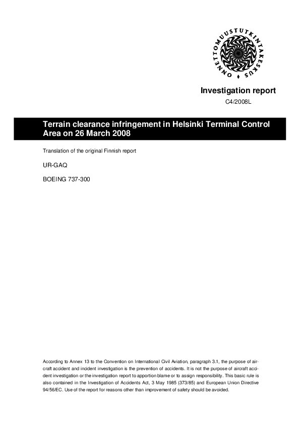AIBF - C4/2008L B733- Terrain clearance infringement in Helsinki Terminal Control Area on 26 March 2