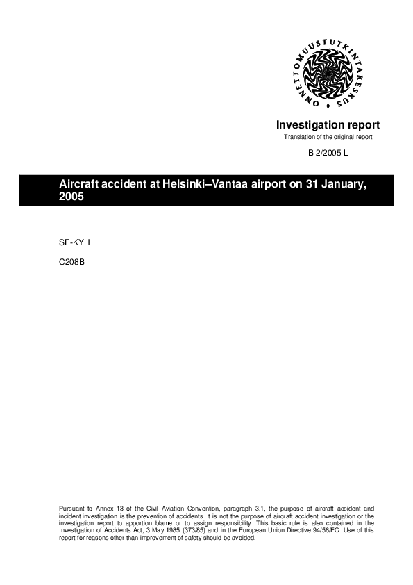On 31 January 2005, a Cessna 208 stalled and crashed on take off from Helsinki-Vantaa following failure to properly de-ice the aircraft.