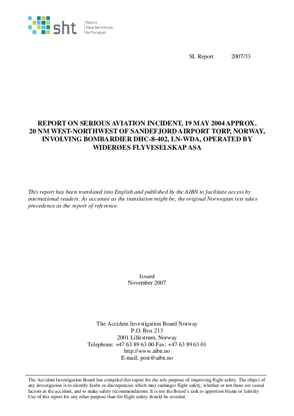 AIBN - SL Report 2007/33 - DH8D engine fire, 18 May 2004, Norway