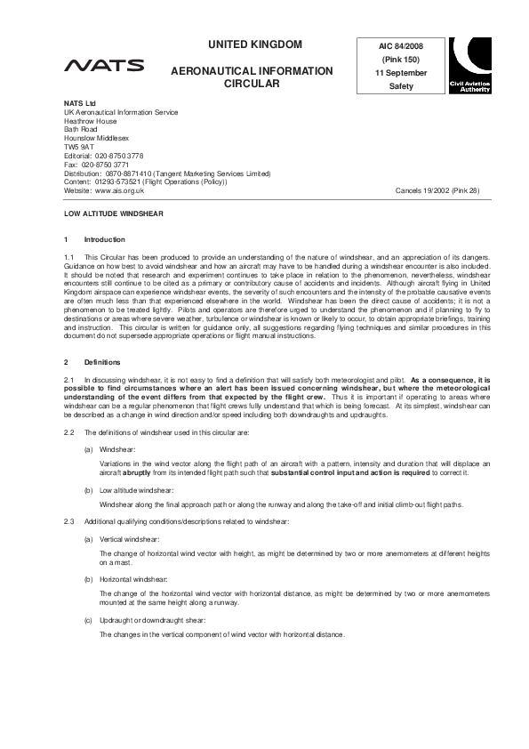 Provides an understanding of the nature of windshear, and an appreciation of its dangers. Guidance on how best to avoid windshear and how an aircraft may have to be handled during a windshear encounter