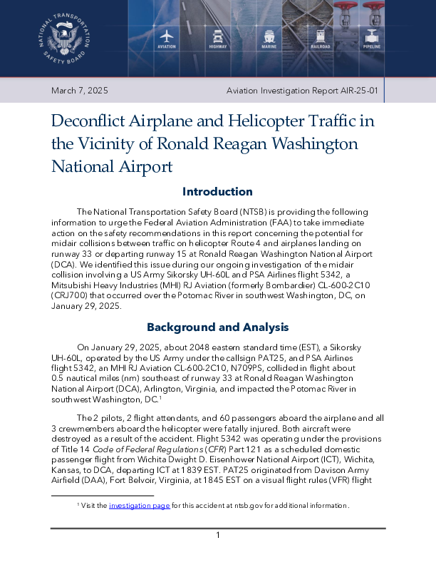 A short report containing two Urgent Safety Recommendations issued during the investigation into the mid-air collision of PSA Airlines Mitsubishi CRJ700 (N709PS) and US Army Sikorsky UH60 helicopter in the vinicinity of Washington National airport on 29 January 2025.